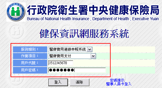 ☉使用對象:特約中且有VPN專線之醫事機構 Step1:請用滑鼠左鍵點右側連結健保資訊網服務系統VPN 會開啟如下圖網站畫面。 Step2:如下圖所示填入完成後,按一下登入。 註:用戶代號請輸入『醫事機構代號(即院代)』,不同的『作業項目』可設定使用不同密碼登入,若該項目功能為首次使用時,用戶密碼預設值為『銀行帳號』(不足14碼前面請補0),登入後可自行變更密碼。若皆無法登入時,請洽詢所屬健保局窗口小姐。 |