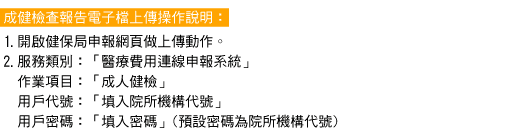 相關規定:成人預防保健檢查結果(報告電子檔)自提供服務日次月1日起60日內,務必將電子檔上傳至健保資訊網VPN-成人健檢作業項目或直接於網頁內登錄,否則事後將追扣該項目費用;另明定成人預防保健服務二階段服務間隔時間不得超過六個月,違反以上規定者,本署不予核付第二階段服務之費用。