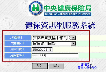 ☉使用對象:特約中且有VPN專線之醫事機構 Step1:請用滑鼠左鍵點右側連結健保資訊網服務系統VPN 會開啟如下圖網站畫面。 Step2:如下圖所示填入完成後,按一下登入。 註:用戶代號請輸入『醫事機構代號(即院代)』,不同的『作業項目』可設定使用不同密碼登入,若該項目功能為首次使用時,用戶密碼預設值為『銀行帳號』(不足14碼前面請補0),登入後可自行變更密碼。若皆無法登入時,請洽詢所屬健保局窗口小姐。 |