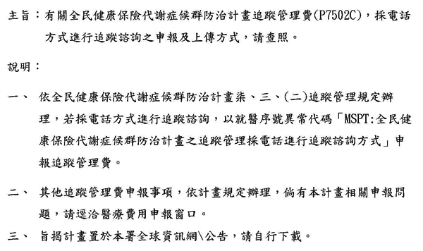有關代謝症候群防治計畫追蹤管理費(P7502C)採電話方式進行追蹤諮詢之申報及上傳方式