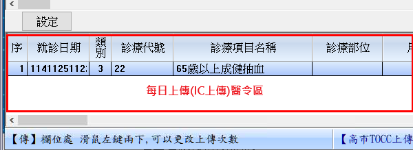 診療作業畫面: *更版後新增掛入資料醫令時程代碼會自動帶入*歷史病歷需手動調整更新IC上傳!