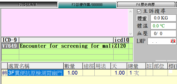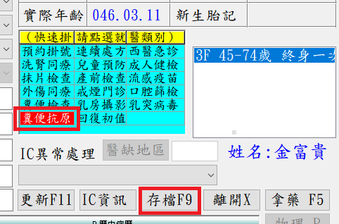 ●掛號作業:同各項預防保健掛法->執行IC卡掛號,點選快速選單『糞便抗原』,再按下存檔即可。
