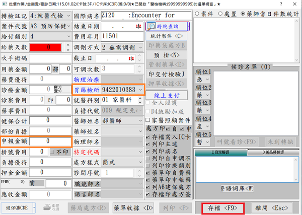 ● 診療作業:進入『F3診療作業』看診畫面,直接按下「vF9」