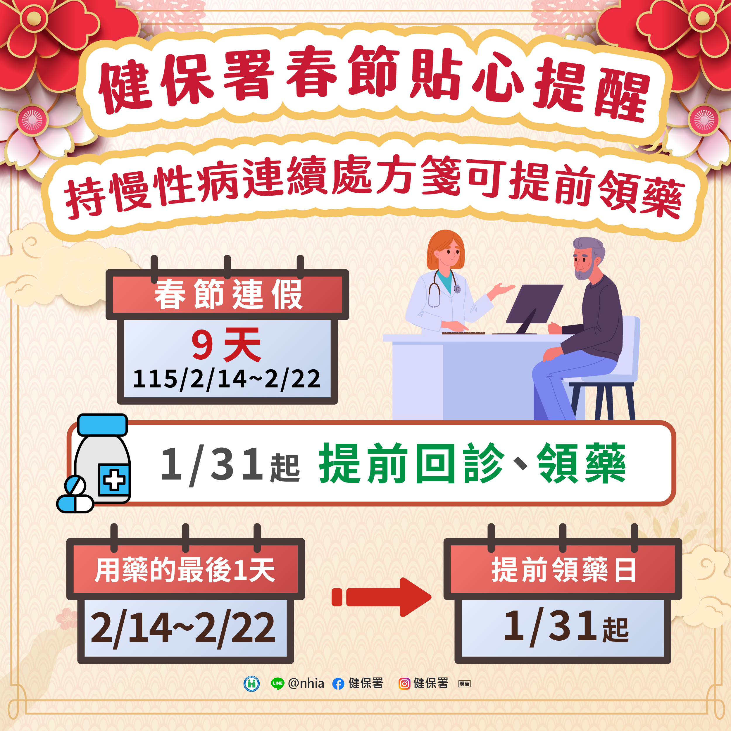 因應春節9天連假持慢性病連續處方箋可提前領藥