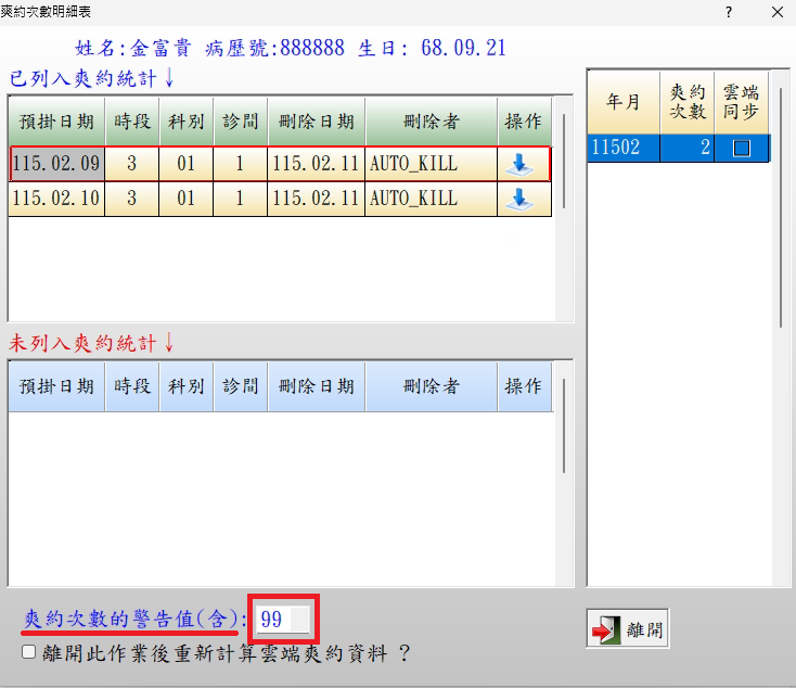 ●『爽約次數的警告值(含)』右方欄可設定需提醒次數(如上圖紅框處)