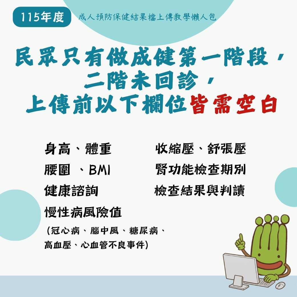 Q:根據上圖說明二階未回診時,醫聖診療系統成健報告批次上傳相關欄位可否先登打完整