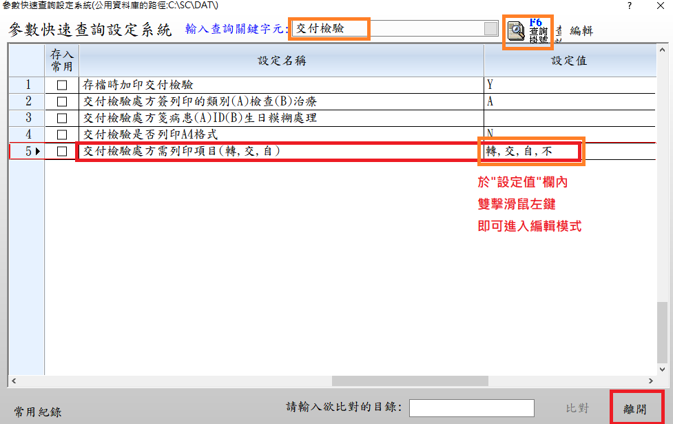 於「交付檢驗處方需列印項目(轉,交,自)」右方設定值欄位,依院所需求修改即可