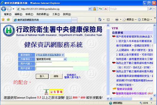 ¥Ø«eÂ卯¾÷ºc³s½u¡i°·«O¸ê°TºôªA°È¨t²Î¡]VPN¡^¡j¤§ºô¯¸ºô§}¬°¡uhttp://10.253.253.242/idcportal¡v¡CÂ卯¾÷ºc©ó¾÷ºc¤º³¡¤§ºô¸ô³]©wÀ³¤w¶}©ñ¸Ó¾÷ºc¥i³s³q¸Óºô¯¸¡A¥Ø«eºô¯¸¦ì§}¬°¡u10.253.253.242¡v¡A³s±µ°ð¬°¡u80¡v¡C